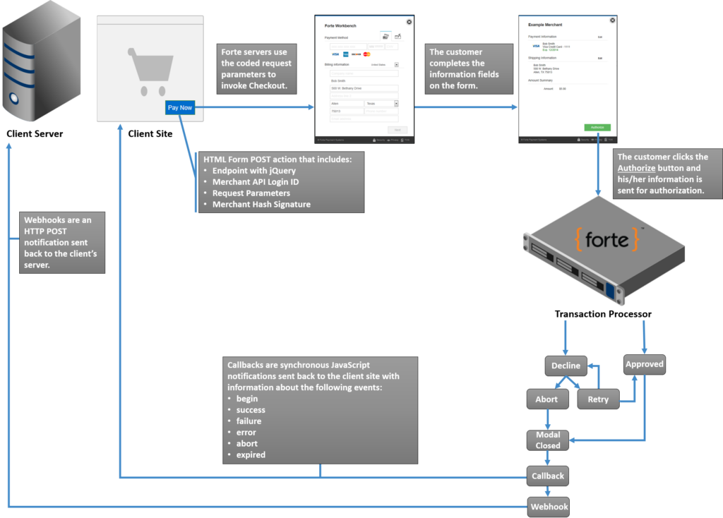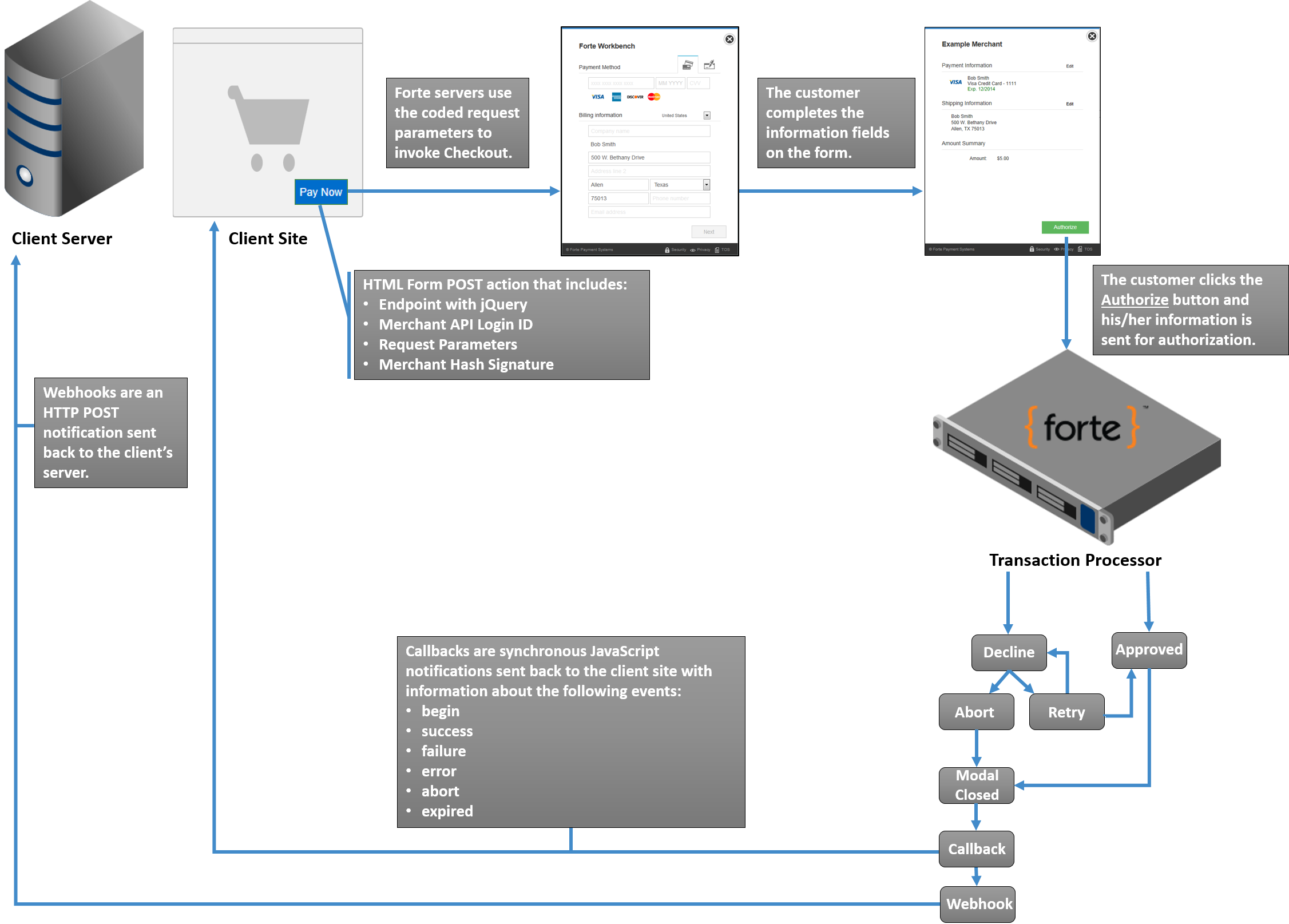 Checkout’s Pay Now button uses an HTML form POST action with a signature to create the modal window. When the customer clicks the button with coded parameters on the client side, Forte servers read the parameters and populate the modal window. The JavaScript, https://checkout.forte.net/v2/js